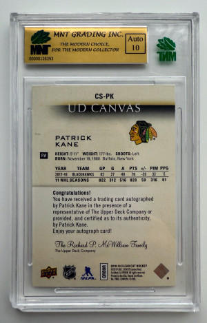 2018-19 UD CLEAR CUT CANVAS AUTO PATRICK KANE /25 MNT 9.0