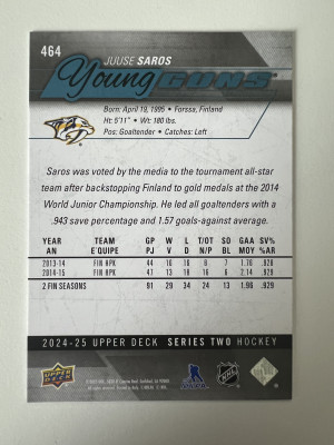 2024-25 Upper Deck Juuse Saros #464 Rookie Young Guns