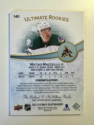 2022-23 Upper Deck Ultimate Collection Matias Maccelli Rookie /799 Jersey Patch
