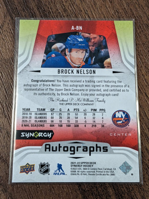 Brock Nelson Auto /25 2021-22 Synergy Autographs Red #ABN