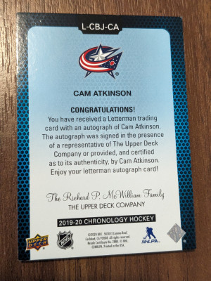 Cam Atkinson Letterman auto T 2019-20 chronology