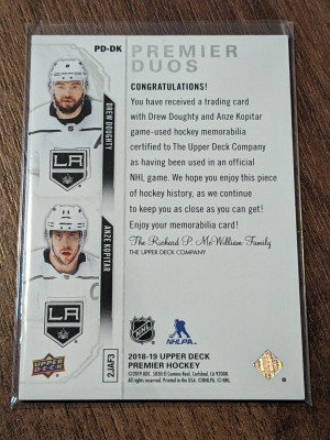 DREW DOUGHTY ANZE KOPITAR 8/99 2018-19 PREMIER DUOS DUAL JERSEYS 2 COLORS LA