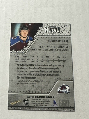 Bowen Byram 2020-21 Skybox Metal Universe Green #120 /10 Rookie Auto Avalanche