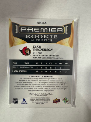 2022-23 Upper Deck Premier Rookie Patch Auto /35 Jake Sanderson