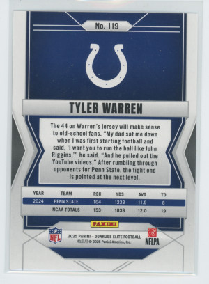 2025 Panini Donruss Elite Football Tyler Warren #119 Status Sparkle RC 162/499