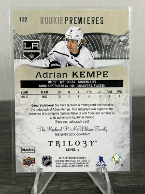 2017-18 UD Trilogy Adrian Kempe Rookie Premieres Level 3 Auto /49