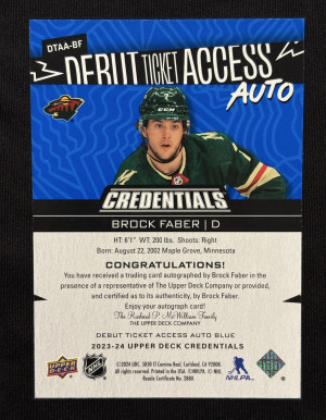2023-24 Upper Deck Credentials Debut Ticket Access Auto Rookie Blue 29/35 #DTAABF Brock Faber