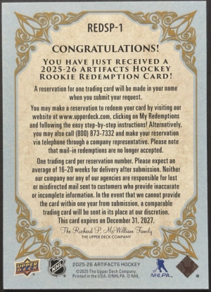 2025-26 Upper Deck Artifacts Hockey Rookie Redemption SP1