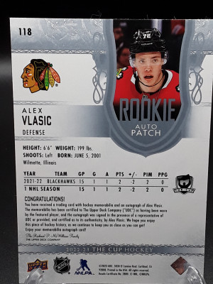 2022-2023 The Cup Alex Vlasic Rookie Patch Auto /249 Blackhawks 3 Color Patch