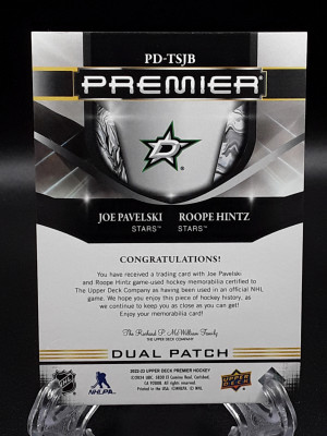 2022-23 Upper Deck Premier Dual Patch Gold Joe Pavelski /15 #PD-TSJB Stars