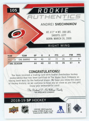 2018-19 SP #105 Andrei Svechnikov Rookie Authentics Jersey
