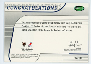 2002-03 Parkhurst #GJ-38 Rob Blake Jersey 1 of 90