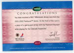 2001-02 Parkhurst Ray Bourque Milestones Jersey 1600 Games 1 of 50