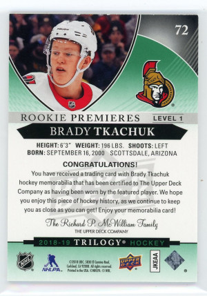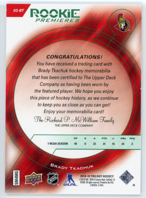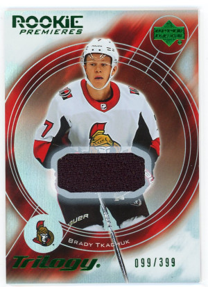 2018-19 Upper Deck Trilogy Brady Tkachuk '03-04 15th Anniversary Retro Rookie Jersey /399