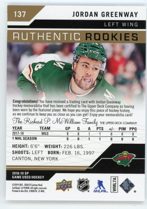 2018-19 SP Game Used Jordan Greenway Rookie Jersey Gold /499