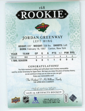 2018-19 Artifacts Jordan Greenway Rookie Jersey Silver /499