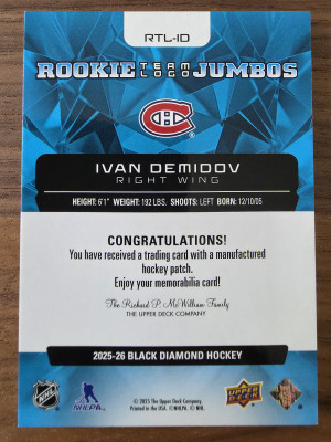 25-26 BLACK DIAMOND ROOKIE TEAM LOGO JUMBOS - IVAN DEMIDOV #RTL-ID CANADIENS