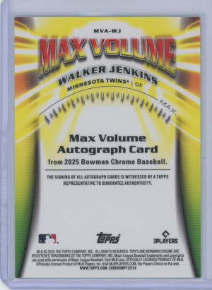 2025 Bowman Chrome Baseball Walker Jenkins #MVA-WJ Max Volume Autograph 10/99