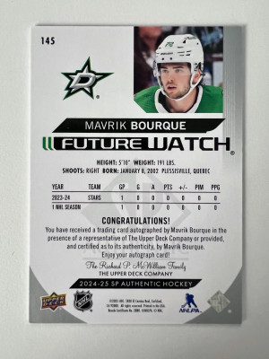 2024 Upper Deck SP Authentic Future Watch Mavrik Bourque Rookie 186/999