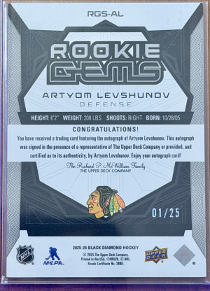2025 Artyom Levshunov Black Diamond Rookie Gems Signatures Auto /25