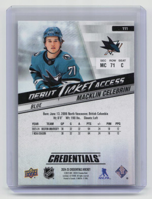 2025 UD Credentials Debut Ticket Access Macklin Celebrini #111 Blue RC 317/399