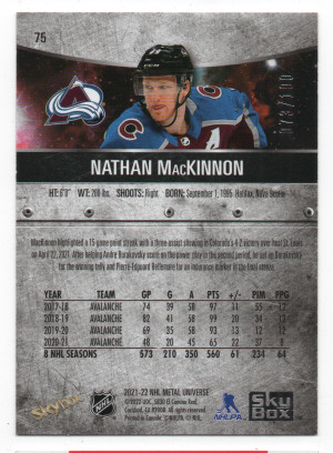 2021-22 Skybox Metal Universe Precious Metal Gems Red #75 Nathan MacKinnon /100