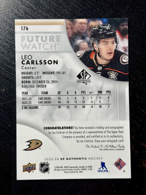 2023-24 SP Authentic Leo Carlsson #176 #/999 Anaheim Ducks