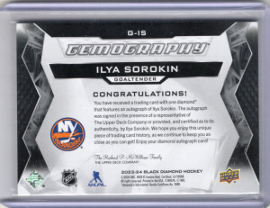 2023-24 UD Black Diamond Ilya Sorokin Gemography Auto 05/25