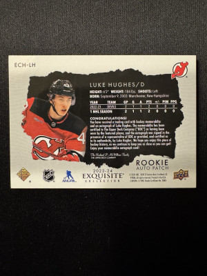 2023-24 UD Exquisite Collection Luke Hughes Rookie Patch Auto /25