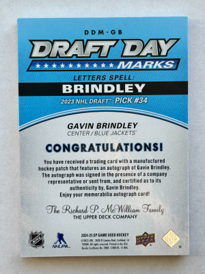 2024-25 SP Game Used Draft Day Marks - Gavin Brindley /35
