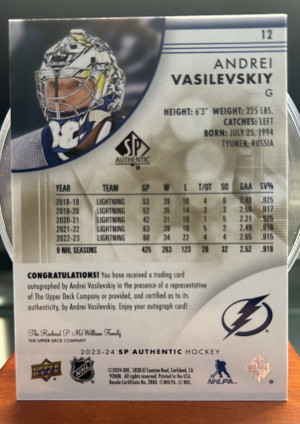 2023-24 SP Authentic - Andrei Vasilevskiy - Tampa Bay Lightning - AUTO