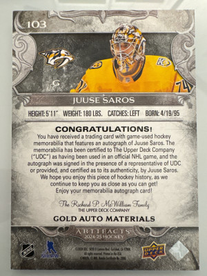 Juuse Saros, 2024-25 Artifacts, Gold Auto Materials /65