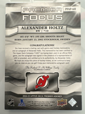Alexander Holtz, 2022-23 Premier Hockey, Premier Focus, Patch Auto /99