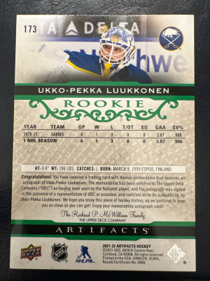 Ukko-Pekka Luukkonen, 2021-22 Artifacts, Rookie Jersey Patch Auto /45