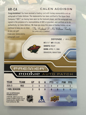 See Photos! Calen Addison, 2021-22 Premier Rookie Auto Patch /65