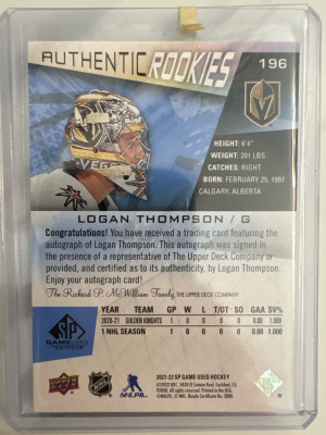 Logan Thompson, 2021-22 SP Game Used Authentic Rookies Auto