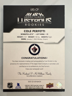 Cole Perfetti, 2021-22 US Black, Lustrous Rookies Auto /199