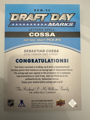Sebastian Cossa, 2023-24 SP Game Used Draft Day Marks /35