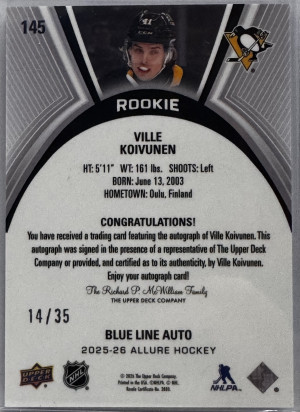 Ville Koivunen RC Blue Line Auto 14/35 -- 2025-26 Allure