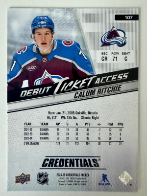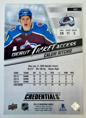 2024 Upper Deck Credentials Debut Ticket Access Calum Ritchie Rookie /999