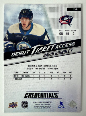 2025 Upper Deck Credentials Debut Ticket Access Gavin Brindley /999 Rookie