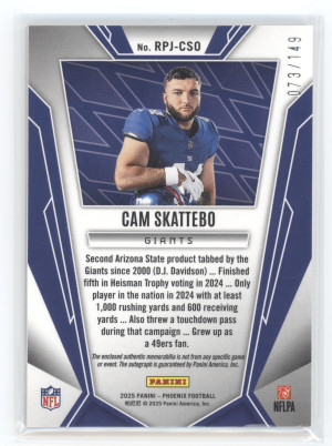 2025 Panini Phoenix Rookie Phenom Jersey Auto Cam Skattebo Silver 073/149