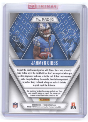 2023 Panini Phoenix Jahmyr Gibbs #RAD-JG Prime Blue Dual Jersey Auto 06/50 RC