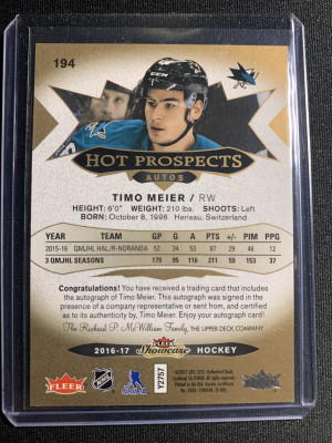 2016-17 FLEER SHOWCASE TIMO MEIER HOT PROSPECTS AUTO /499
