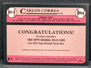 2024 Topps 1989 Topps Relics Black /199 #89BR-CC Carlos Correa Twins Relic /199 [480|89BR-CC]