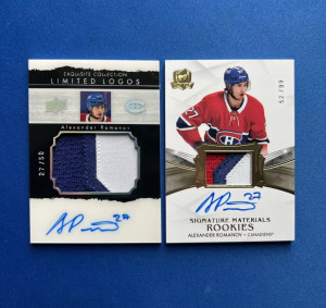 2020-21 UD The Cup - Alexander Romanov Exquisite Collection Limited Logos Rookie Auto Patch JERSEY-NUMBER RPA 27/50 #LLT-AR & Signature Materials Rookies Auto Patch /99 #SO-AR