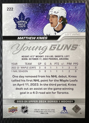 2023-24 #222 Matthew Knies Young Guns RC Toronto Maple Leafs Rookie