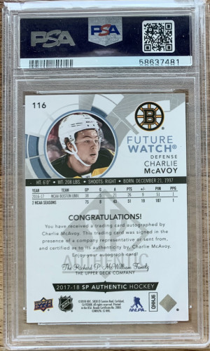 2017-18 SP Authentic Charlie McAvoy Future Watch Auto /999 PSA 10