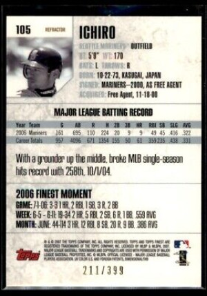 Ichiro Suzuki 2007 Finest Refractors Blue 211/399 #105 Seattle Mariners
