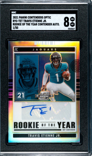 2021 Contenders Optic Rookie of the Year Silver Prizm Auto Travis Etienne 1/40 SGC 8 Jersey match